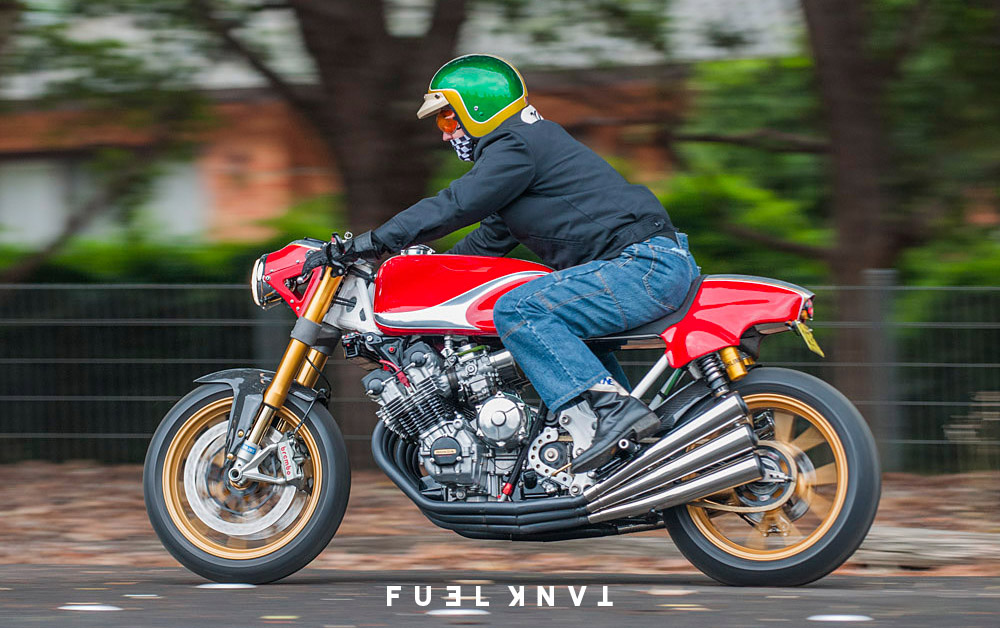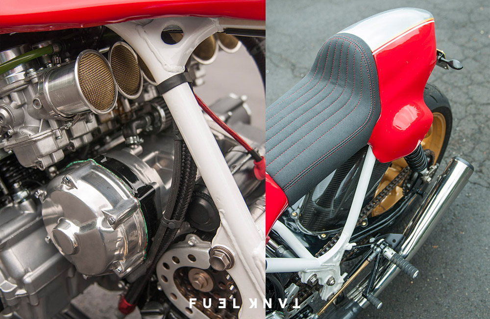 The build, which began in 2012, has generated an impressive list of bodywork and engine modifications. Incorporating an eclectic mix of OEM parts, fabricated components and second hand items, Vaughan has blended them together to create his CBX vision. Some of the many jobs completed at his Motor Retro workshop include the frame de-tabbing and gusseting, the widening of the swing arm, structural bracing using oval sections of steel tubing, the custom mounted MCA headlight, modification of a custom made exhaust by Pipemaster (thanks Peter) and of course the impressive all alloy, hand-formed bodywork. Transplanted upgrade parts were acquired from the front end of a Ducati 1098R and the rear of a Ducati 999 and a few bolt on items like Tarrozzi foot rests and Speedymoto handlebars were modified to fit.