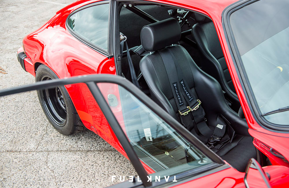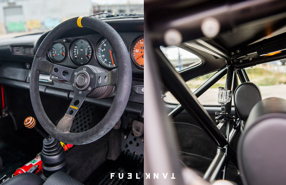 The interior has been completely redone but utilises the original dash. It has a deleted back seat (RS style), full roll cage with RS door trims and two BF Torino period basket weave Recaro seats complete with a driver’s four-point harness. A Momo Mod 07 wheel and wooden 917 inspired shift knob complete the spartan interior. It’s no fuss, fit for purpose as a classic ‘70s Porsche racer should be.