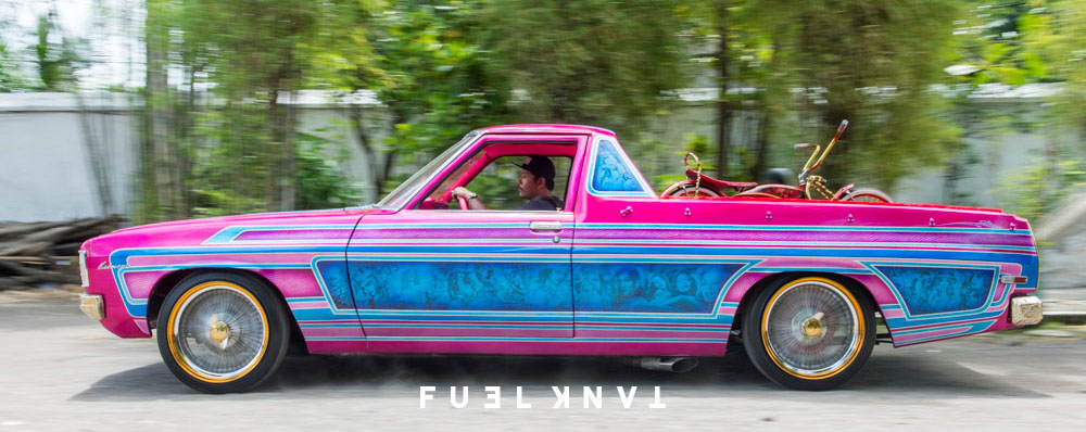 Thinking on his feet, as most petrolheads in Indonesia have to do, Bintang worked to marry his interest in lowrider culture with what stock he had available to him in the local classifieds. We were so impressed with what he came up with, we awarded it the Fuel Magazine best of show at Kustomfest 2016. We liked the mix of Australian working ute combined with American lowrider culture as well as the ingenuity used to work through problems. For instance, look closely and you’ll see that the metallic paint, the fading and the pinstriping is all skillfully hand painted, but the photo based parts of the design are actually computer generated. It’s always fascinating to see how the Indonesian builders and artists overcome issues through a build and ‘Pinky Banditos’ is no exception.